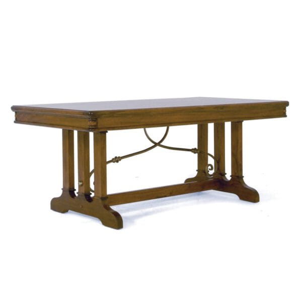 Dark oak coloured dining table with simple yet stylish metal scrollwork.